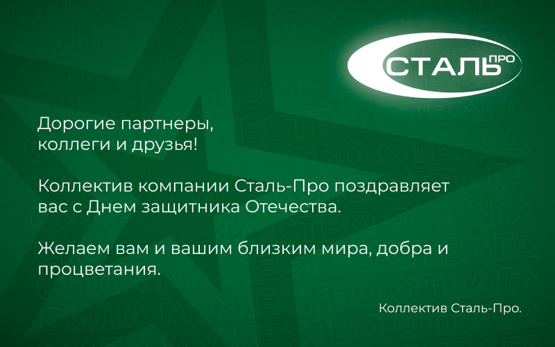 Коллектив компании Сталь-Про поздравляет вас с Днем защитника Отечества. Днём силы, мужества и отваги. Путь ваши решения будут смелыми, планы точными, а победы твердыми. От всей души желаем вам и вашим близким мира, добра и процветания.